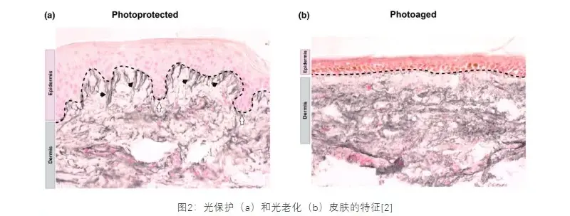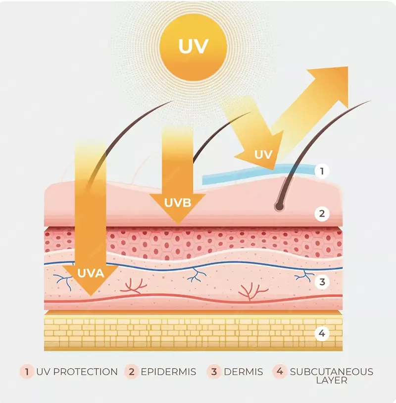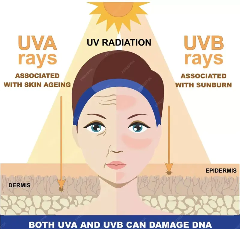 Як UVA, так і UVB можуть спричинити пошкодження шкіри, але їхні ефекти відрізняються головним чином через глибину проникнення. Очевидно, що багатше УФА може проникати глибше в дерму та безпосередньо пов’язане з фотостарінням, оскільки вони вироблятимуть АФК і руйнуватимуть колаген і еластин, що призведе до зморшок, втрати еластичності шкіри та інших ознак передчасного старіння. Навпаки, UVB в основному впливає на епідерміс, спричиняючи сонячні опіки (сонячну еритему) та короткочасне вироблення меланіну, тоді як тривалий вплив може призвести до гіперкератозу та значно збільшити ризик злоякісних пухлин шкіри.