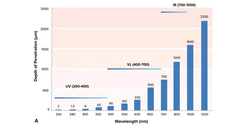 Як показано на малюнку вище, видиме світло має великий вплив на шкіру, оскільки ця смуга має більшу глибину проникнення в шкіру. Червоне світло може проникати через епідерміс і дерму та досягати жирового шару, що вказує на зв’язок між довжиною хвилі та глибиною проникнення, а також зворотне співвідношення між довжиною хвилі та енергією, тоді як синє світло має вищу енергію та меншу глибину проникнення, ніж червоне світло.