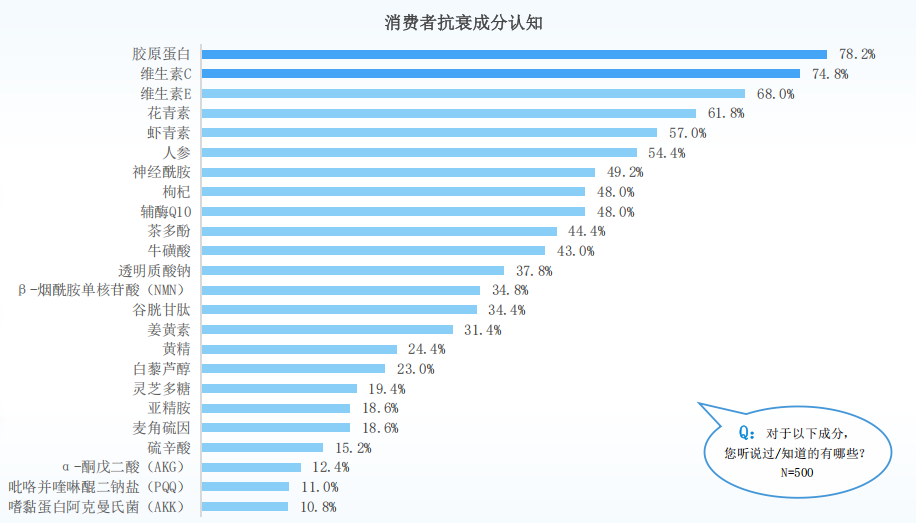 Завдяки освіті та розвитку ринку, колаген наразі є високо визнаним «інгредієнтом проти старіння» серед споживачів. В опитуванні щодо розуміння основних інгредієнтів проти старіння, колаген (78,2%), вітамін С (74,8%) і вітамін Е (68%) є трьома найпопулярнішими інгредієнтами, які споживачі впізнають для пероральних засобів проти старіння. Серед 5 найкращих сприйняття інгредієнтів проти старіння в різних вікових групах колаген, безсумнівно, є «зірковим інгредієнтом».
